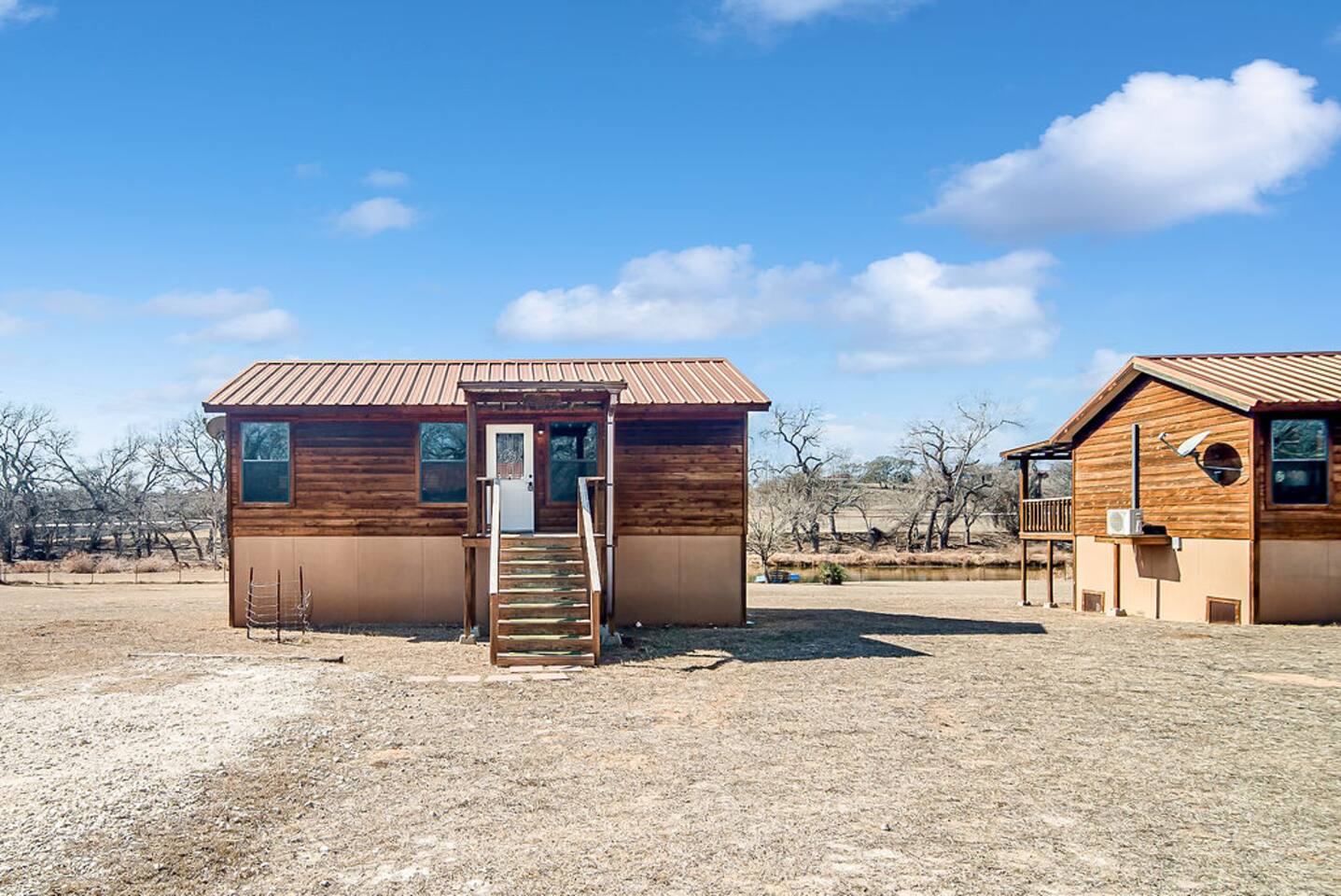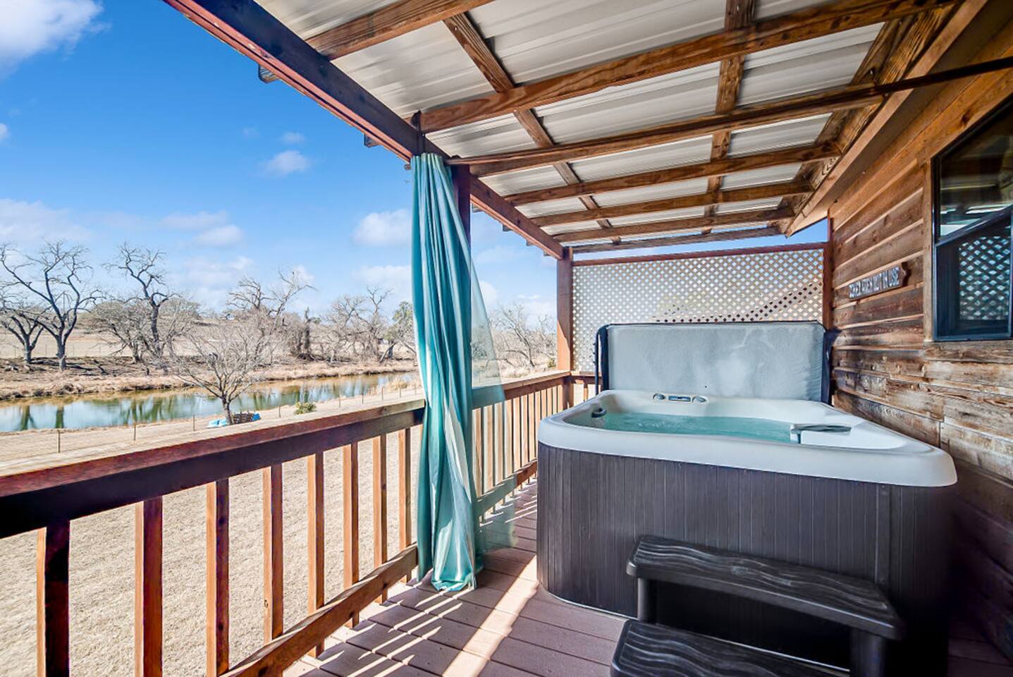 Located just 4 miles from town, one of five charming and well thought out cabins await your arrival. Enjoy a king bed, large bathroom, kitchenette with full sized refrigerator, and private deck featuring a hot tub and electric grill for your stay. In addition, Live Oak Creek is just steps away where you can spend your time fishing, paddle boating, or swimming. There is also a family owned bar at the entrance of the property called "The Top".